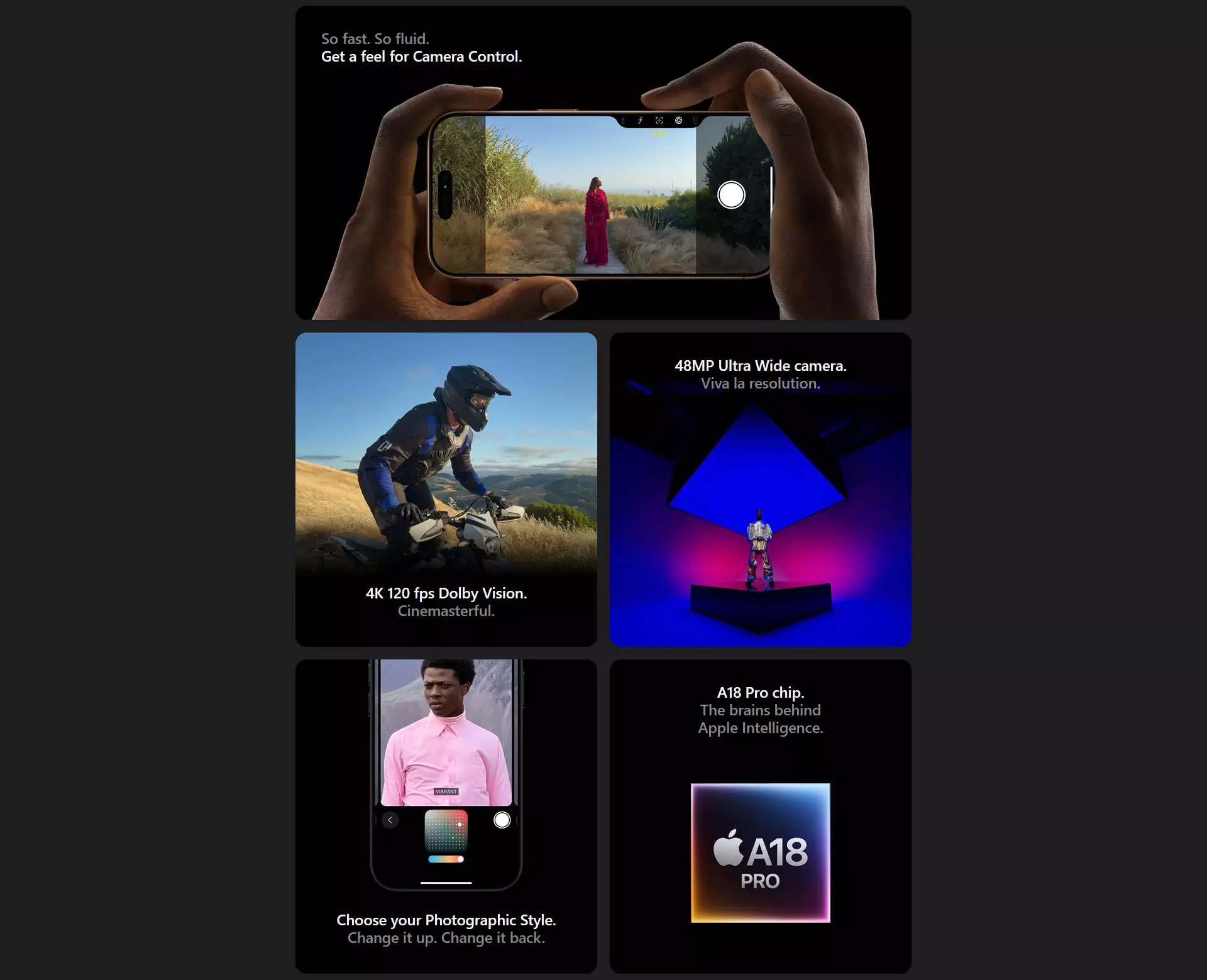 | Chip | A18 Pro chip New 6-core CPU with 2 performance and 4 efficiency cores New 6-core GPU New 16-core Neural Engine |