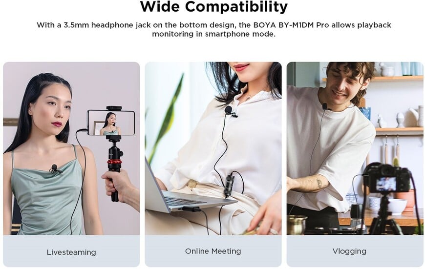 The BOYA BY-M1DM Dual Omnidirectional Lavalier Microphone features two lav mics attached to a single 3.5mm TRRS connector, making it easy to record two people at the same time to your smartphone, DSLR/mirrorless camera, camcorder, recorder, computer, or similar device.