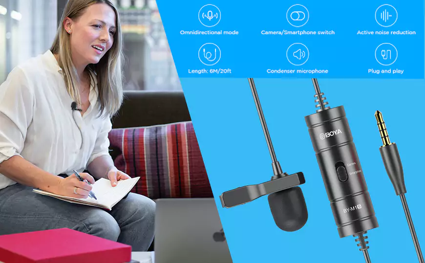The BOYA BY-M1S is an upgraded omnidirectional lavalier microphone ideal for vlogs, presentation, podcasting, live streaming and much more.