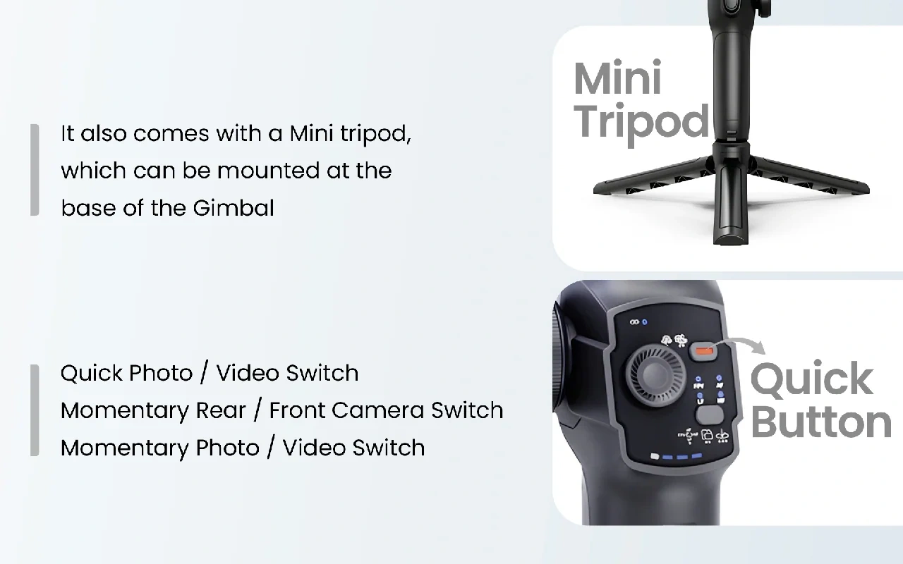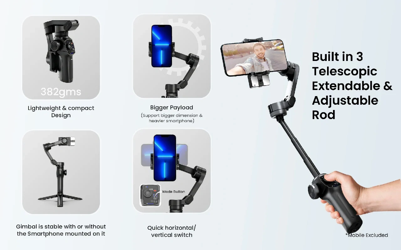 Potable and Foldable Easy to Carry during the travel, Tilt Angle: 160°, Roll Angle: 325°, Pan Angle: 340°, Weighing only 362gms.