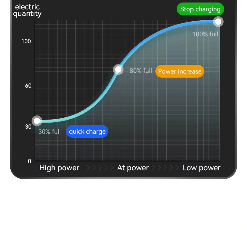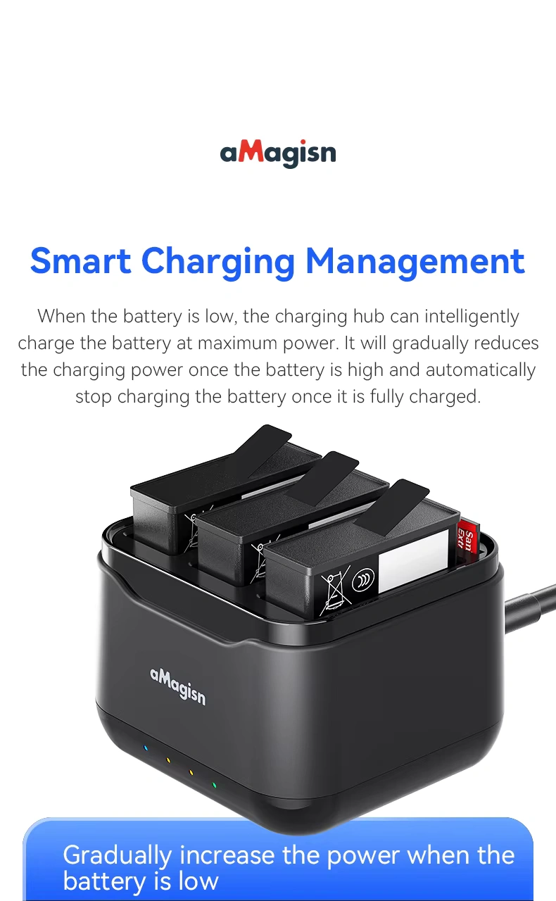 When the battery is low, the charging hub can charge the battery autonomously at maximum power. It will gradually reduce the charging power once the battery is high and automatically stop charging the battery once it is fully charged.