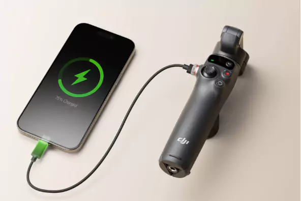 An integrated rechargeable battery keeps the Mobile 7P running for 10 hours at a time. Once depleted, it can be recharged in 2.5 hours using the included power cable and USB-C port. When the Multifunctional Module’s intelligent tracking is enabled, the gimbal’s runtime is reduced to 5 hours. When the fill light is set to maximum brightness, the runtime is reduced to 4 hours. The gimbal’s USB-C port can also be used as a power output that charges your smartphone when the gimbal is powered off.