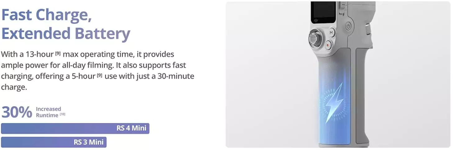 - The RS 4 Mini battery grip contains a built-in 3100mAh battery that provides a runtime of up to 13 hours (fixed mode), generous enough for shooting all day.