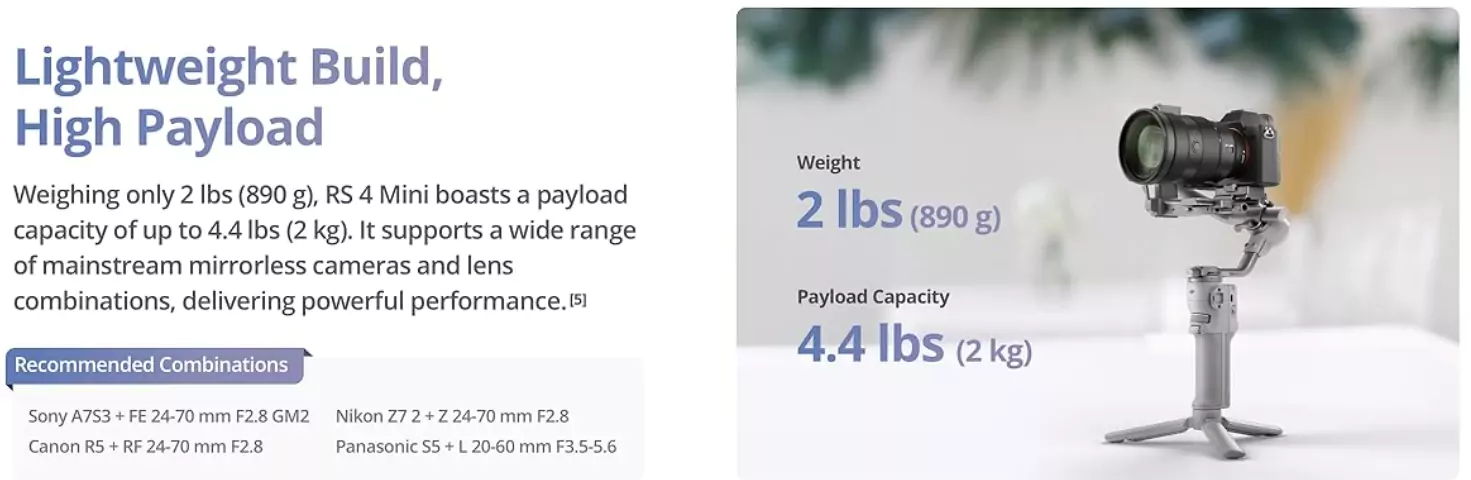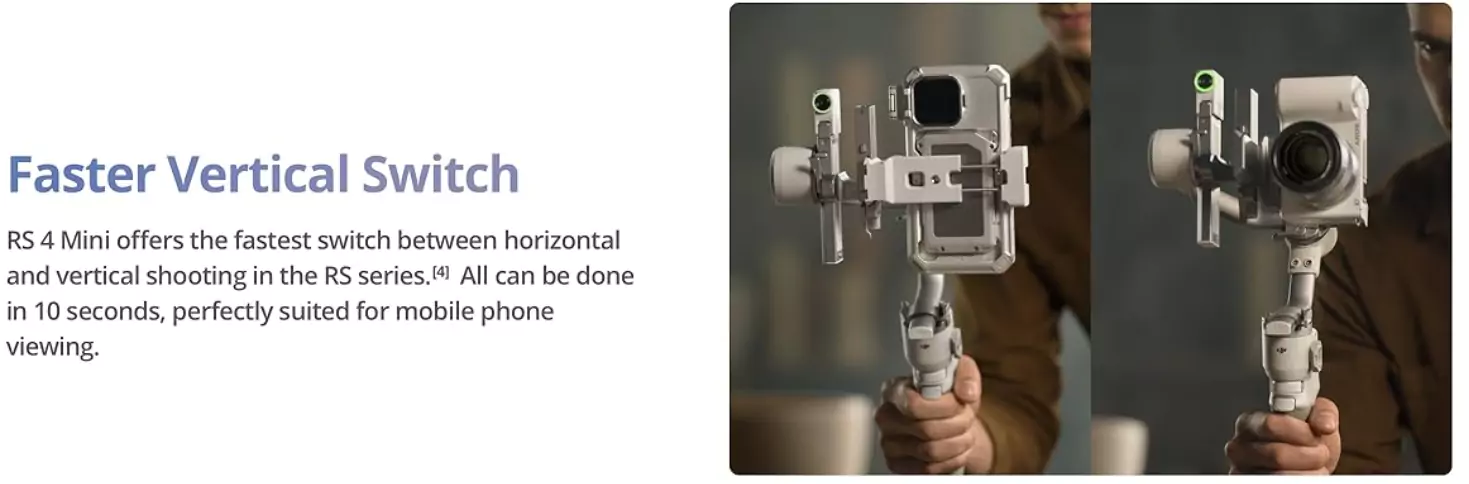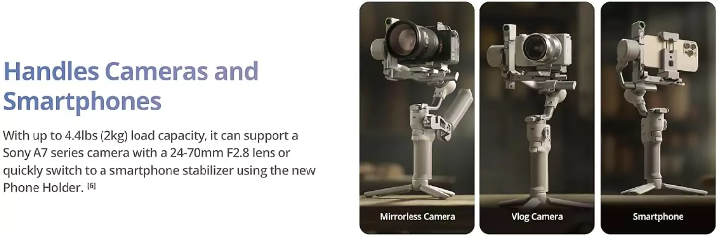 While the gimbal supports mirrorless camera rigs up to 4.4 lb, you can convert the RS 4 Mini into a smartphone gimbal with the optional Phone Holder. The phone holder offers more features and range of movement than a standard smartphone holder. The holder can also be used to monitor your camera image via the Ronin smartphone app.