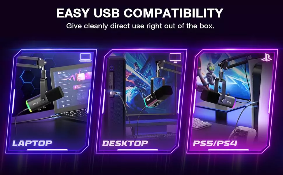The PC gaming microphone USB kit includes a boom arm for easy positioning, mute button and gain knob for precise control, headphones jack for real-time monitoring, and headphone volume control.