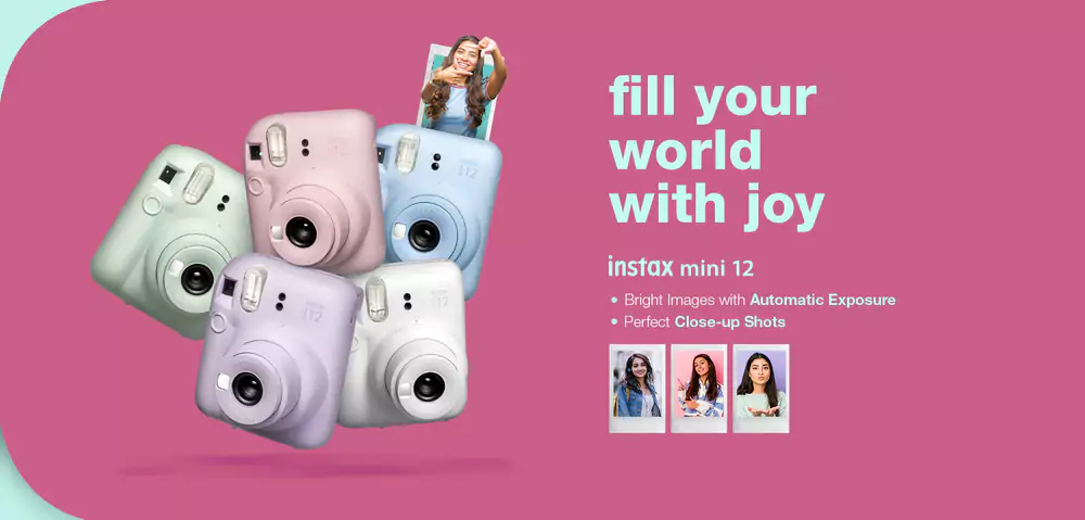 Dedicated to the joy of living in the moment, the FUJIFILM INSTAX MINI 12 Instant Film Camera provides easy-to-use controls and quickly produces memorable credit-card-sized photos. Offered here in blossom pink, this instant camera is ready to go with a simple twist of the lens.