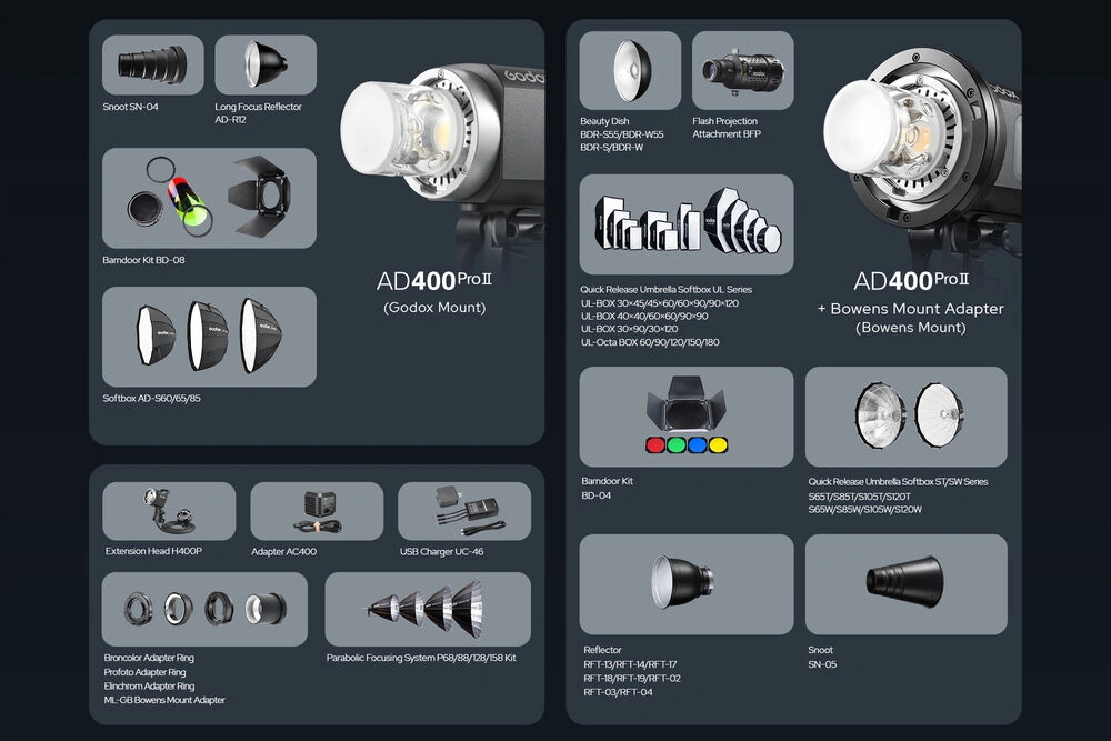 The head has a proprietary Godox mount, but includes a widely compatible Bowens mount adapter to expand your possibilities when it comes to optional modifiers. Godox also offers optional Broncolor, Profoto, and Elinchrom mount adapters if needed. The flash is compatible with a wide range of optional umbrellas thanks to its integrated umbrella hole, as well as with softboxes in different shapes and various light stands.