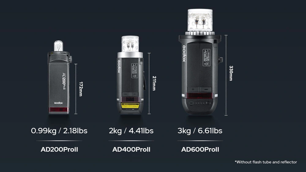 The versatile AD400Pro II is the perfect flash companion for professionals and beginner photographers working not only outdoors, but also in the studio. Just as other popular Godox units, such as the advanced AD600Pro II and the AD200Pro II, the AD400Pro II provides group color functionality. This means that each of the 16 groups will display a different color locally on the flash head for easy group identification even from a distance. Godox has improved the physical body of this flash, bringing a more elegant and modern design that enables intuitive local operation. In addition to the group color capability right at the head of the flash, the AD400Pro II body also has a 2.4″ color screen and a handy rotatable select dial.