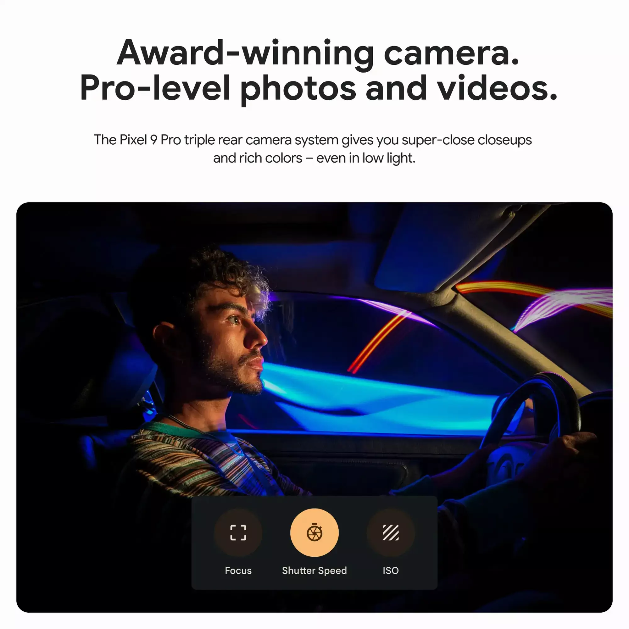 Meet Pixel 9 Pro with Gemini, now in two sizes. It has a sleek, stunning design, and it’s the most powerful Pixel yet. Take pro-level photos and videos with the triple camera system, and make expert edits. And it’s engineered by Google, so it gets the best of Google’s AI first.