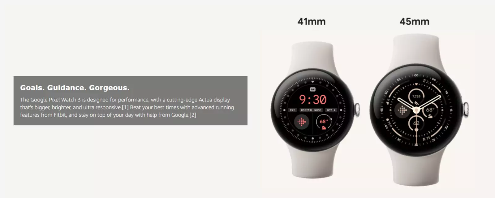 The Google Pixel Watch 3 is designed for performance. The cutting-edge Actua display is bigger, brighter, and ultra responsive.Beat your best times with advanced running features from Fitbit, then use all-new readiness and cardio load tracking to balance rest. And stay on top of your day with help from Google.