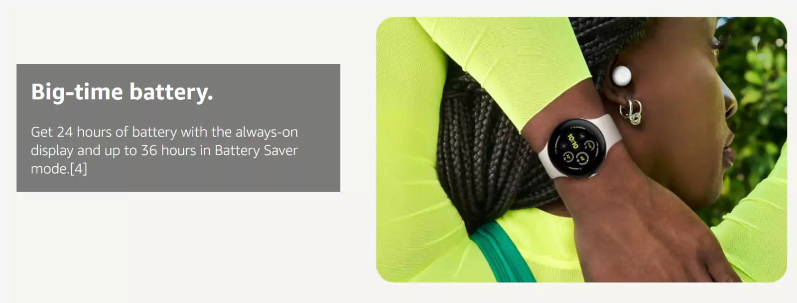 Get 24 hours of battery with always-on display, or up to 36 hours in Battery Saver mode. And the 45mm size has a 35% bigger battery than Pixel Watch 2.