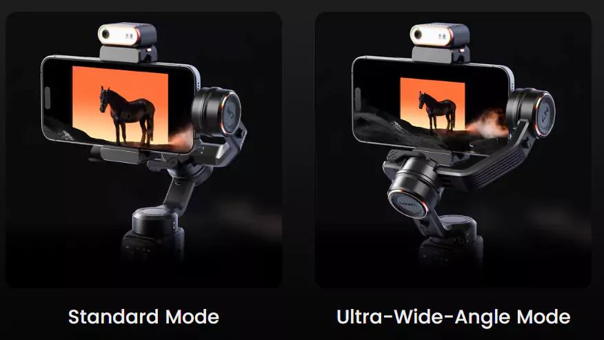 Axis locks on each arm secure the motors in seconds and reduce shake for safer storage. The gimbal has a 360° infinite pan rotation and a 325° tilt range for unrestricted movements. Rapidly switch between standard and ultra-wide-angle shooting modes, allowing you to take advantage of your phone’s wide-angle lens without restricting your view.