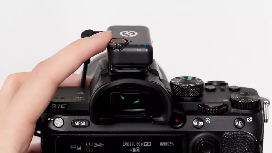 - The transmitters feature 85mAh internal batteries with 9-hour battery life. The camera-mount receiver features a 145mAh internal battery with a 8.5-hour battery life. Once depleted, recharge the components in the included charging case in less than 1.5 hours or via USB-C in 1 hour.