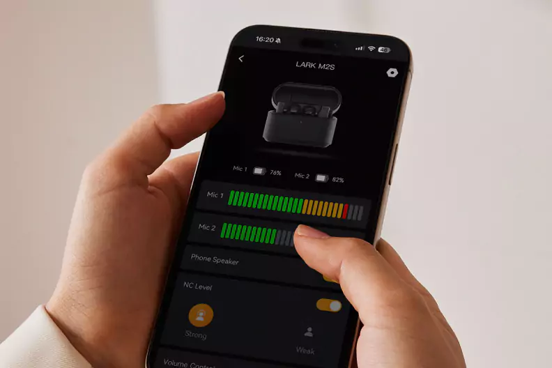 Connect your LARK M2S system to the LarkSound App to adjust parameters like volume and noise cancellation, update firmware, or check real-time audio status—all from your iOS or Android compatible smartphone. Your smartphone can also playback your recordings when connected to the receiver without needing to unplug it.