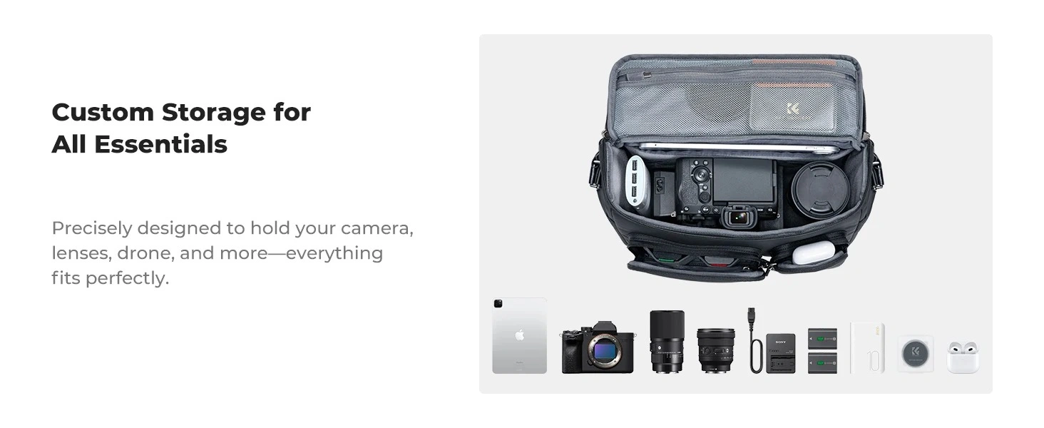 The versatile Urban Wander Sling Bag from K&F Concept has adjustable interior dividers for customized storage and an adjustable strap for a comfortable fit. Made from weather-resistant nylon, it has a set of tripod mounting straps and a water bottle pocket.