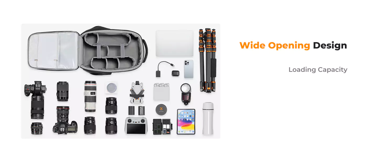 Front fully opened flap designed with the hard shell, which prevent your camera from strike and scratch. Camera bag with 2 internal accessory pockets can store cables, sd cards, power bank. 1 hidden zipper pocket on the back for your phone, wallet and other small items you need to store. tripod holder is featured with 1 secure strap on one bag side. 1 pocket on another side can store umbrella or water bottle.