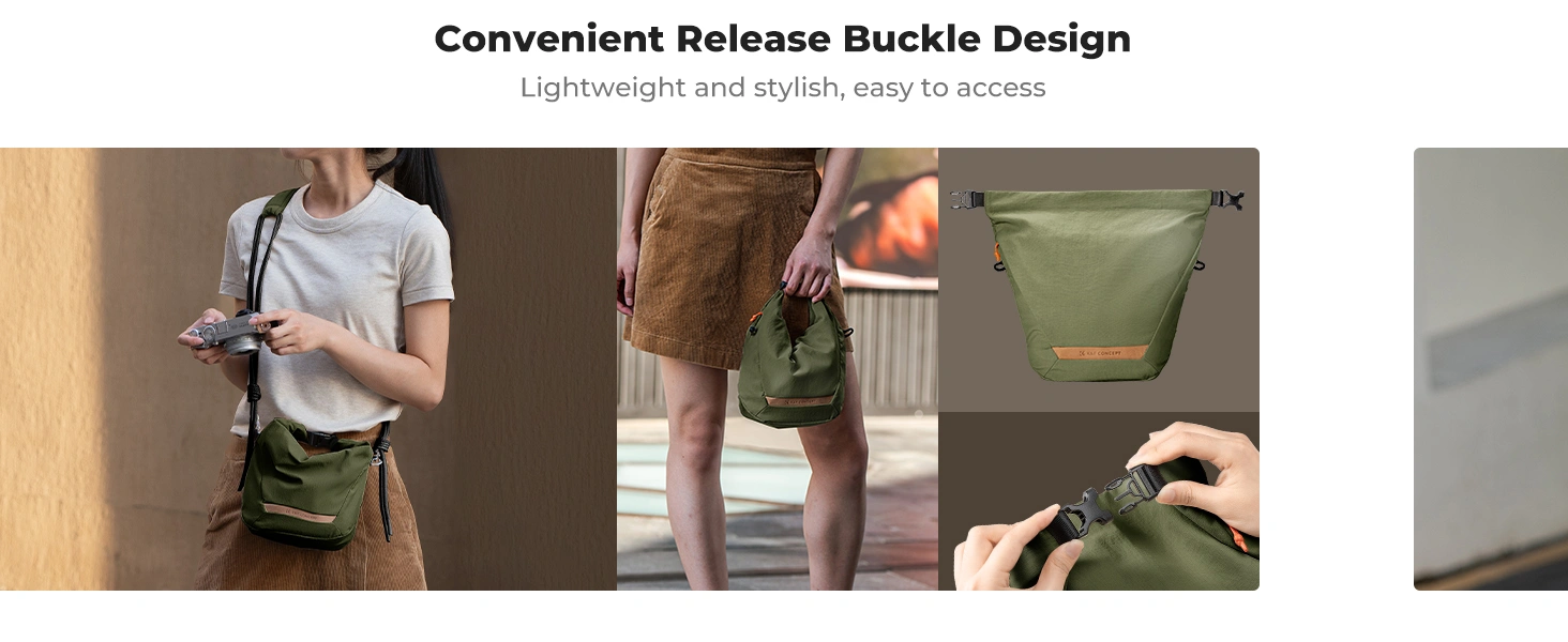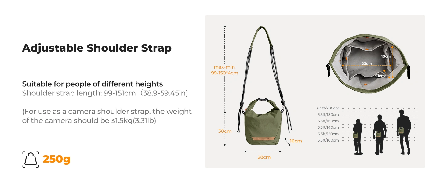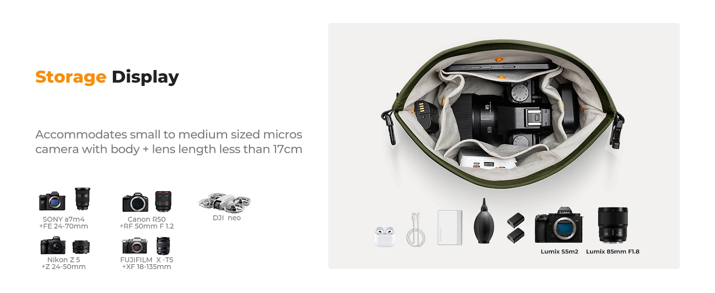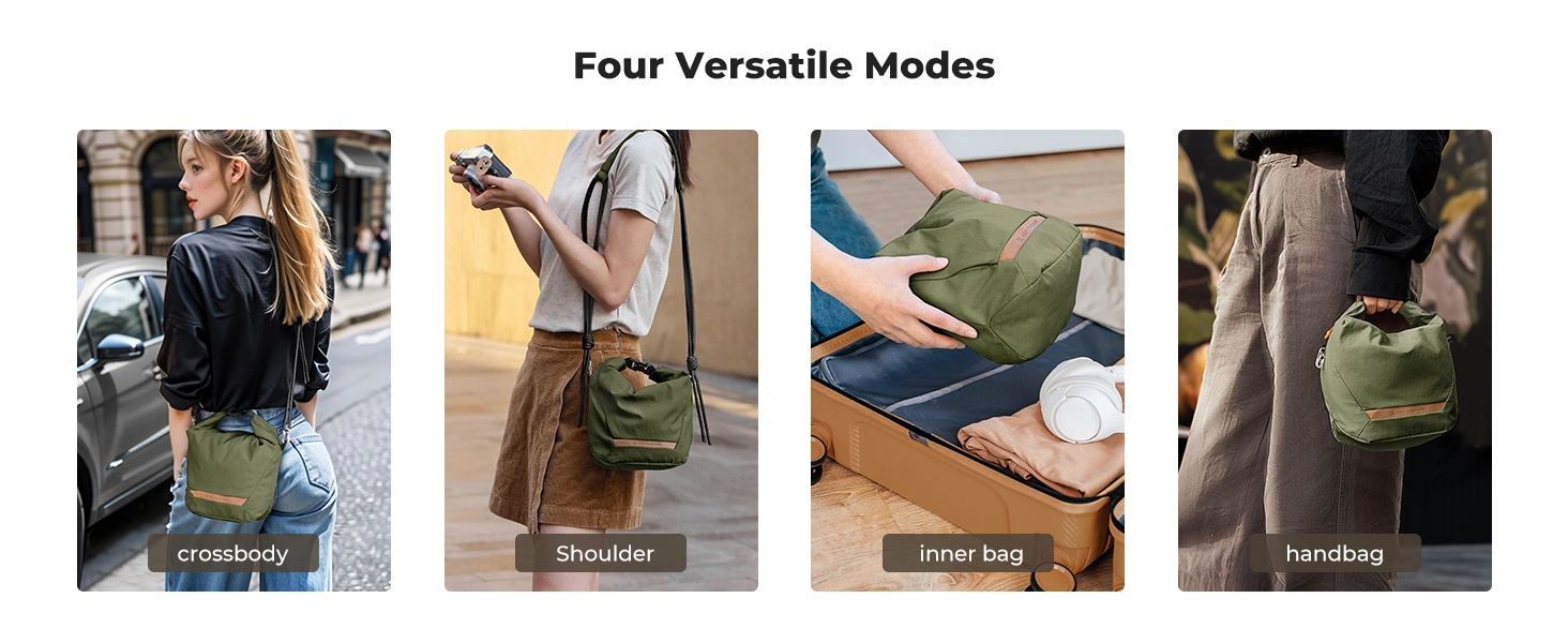 One Camera & One Lens Storage. Functions as a shoulder bag, crossbody bag, handbag, or inner liner bag for versatile use. Lightweight and Stylish with Roll-Top Closure. Combines modern design with a secure roll-top opening for added protection.