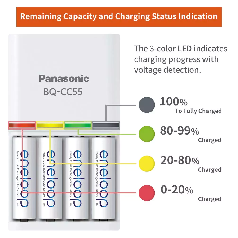 - The 3 Second Battery Scan feature in Panasonic’s advanced charger BQ-CC55 checks battery type, flashing the red LED light to alert the user if a dry battery has been inserted in the charger.