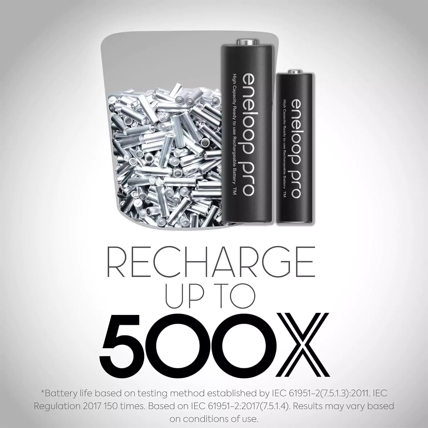 - Panasonic eneloop pro AA rechargeable battery can be recharged up to 500 times.
