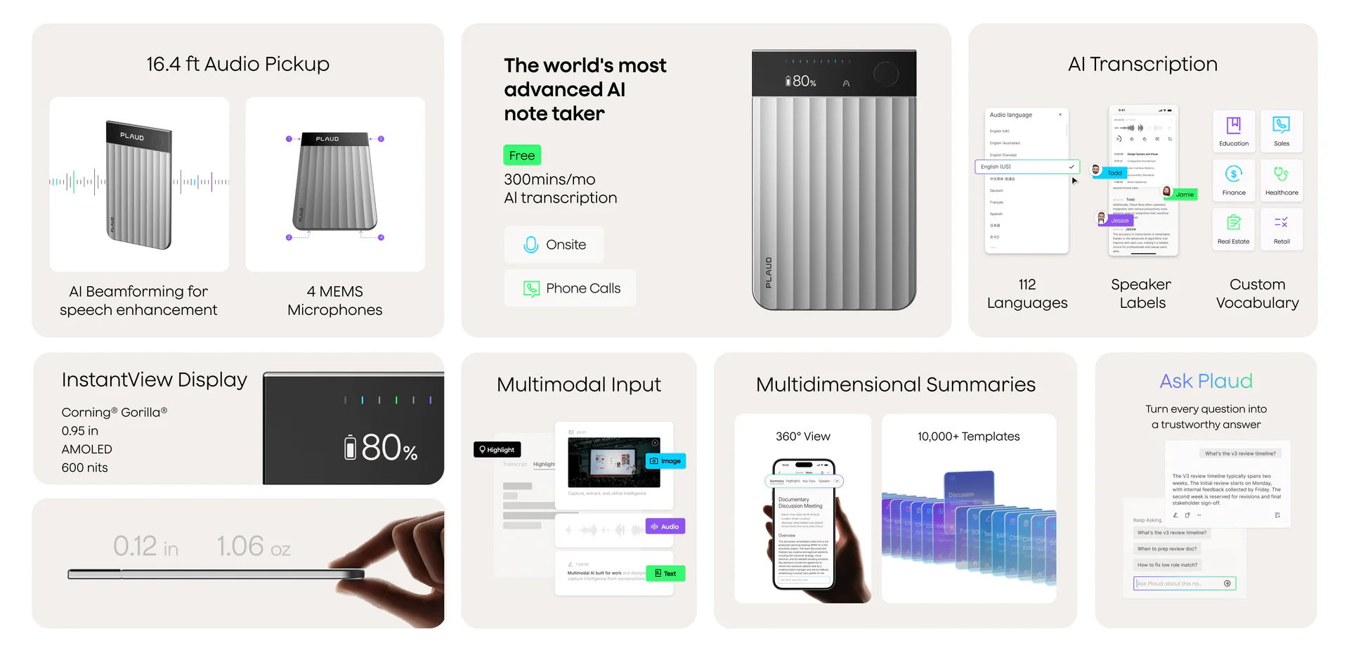 Featuring an industry-first InstantView AMOLED Display, the Note Pro provides real-time status updates, recording modes, and battery levels at a glance. It utilizes a superior 4-MEMS microphone array combined with a Vibration Pickup Unit (VPU) to capture crystal-clear audio from up to 16.4 feet away. Whether it’s a high-stakes boardroom meeting or a sensitive phone call, the Note Pro automatically detects the environment and switches recording modes for you. Powered by top-tier AI models like GPT-4o and Claude 3.5, it transcribes in 112 languages and generates multidimensional summaries tailored to your specific profession.