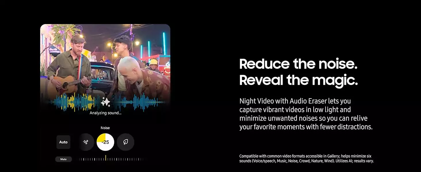 With Galaxy S25 Ultra, you can capture wow-worthy videos, even in dark or noisy environments. Use Night Video to capture your evening out with friends in vivid detail. Then minimize unwanted sounds, like the noisy person next to you, so you can relive your favorite moments with fewer distractions.