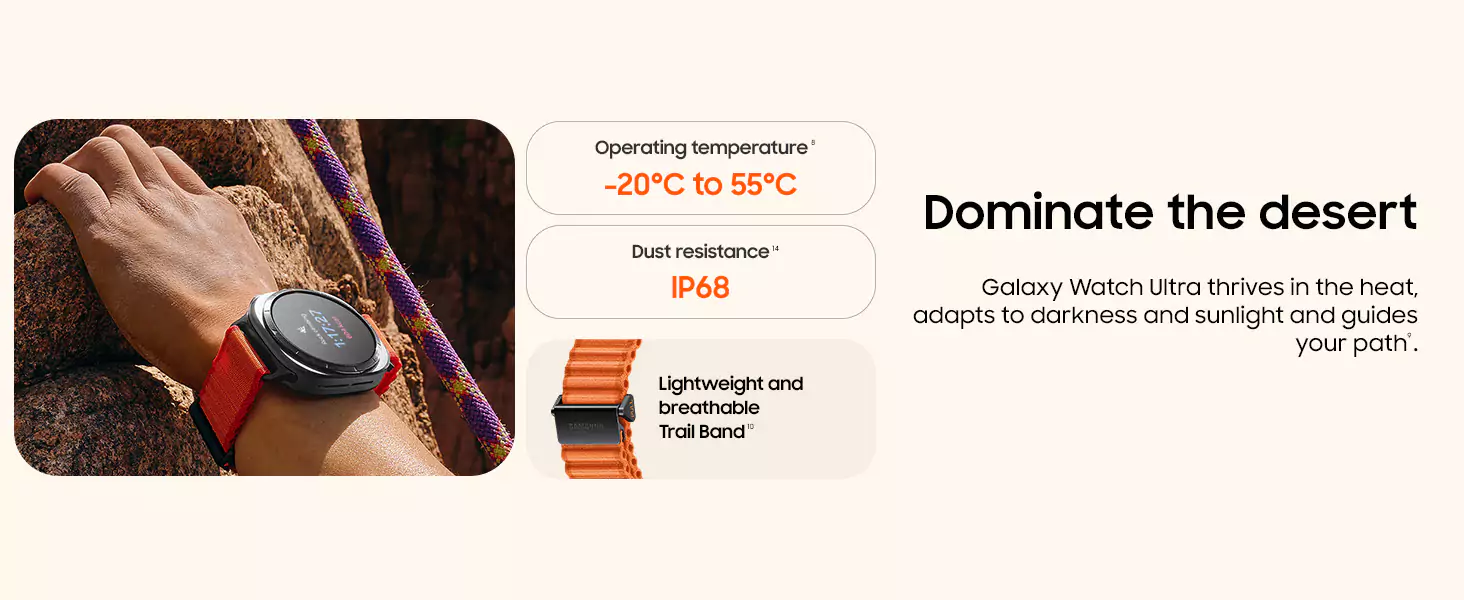 [ULTRA CONVENIENCE] Introducing Quick Button that allows customizations to physical operations & integrates an EMERGENCY SIREN. Galaxy Watch ULTRA has two dedicated watch faces that automatically switch to NIGHT MODE according to illuminance. Other features include Tap & Pay, Gesture Controls & a seamless Galaxy Connected Experience with Samsung Smartphones