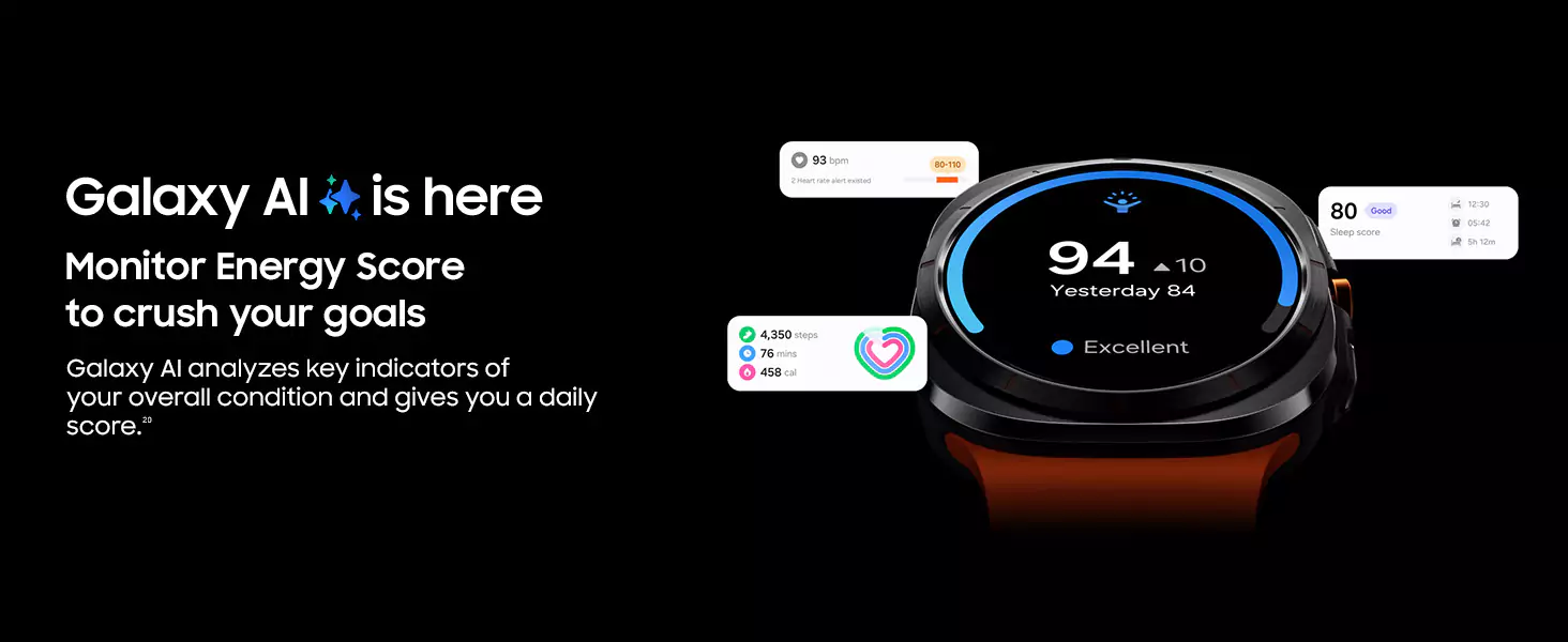 [ULTRA INTELLIGENT] Galaxy AI Powered Health & Fitness monitoring: Energy Score, Booster Card & Personalized HR & FTP help elevate user’s max capability based on daily condition. Paired with Galaxy AI Smartphone, it gives quick reply suggestions to match the context of last messages