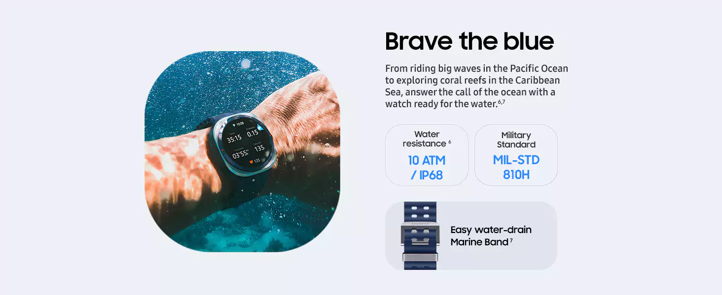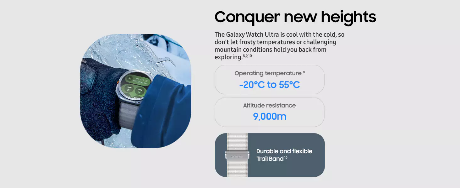 Galaxy Watch Ultra is built for outdoor adventurers who push the limits. With its titanium-tough case, precision tracking capabilities, the power of Galaxy AI and a long-lasting battery, it’s got everything you need to achieve your personal best for days at a time.