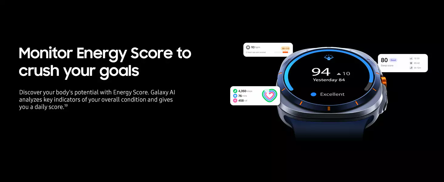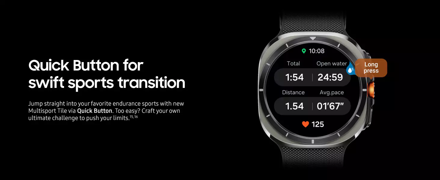 Galaxy Watch Ultra is no ordinary watch —it’s the Watch built for outdoor adventurers who push the limits. Whether you’re a peak seeker, ridge runner or backcountry biker, this sporty Watch is titanium tough to help you go the distance. With its precision tracking capabilities, the power of Galaxy AI and a long-lasting battery, it’s got everything you need to achieve your personal best for days at a time. Get the competitive edge with sleep insights that coach you toward better rest so you can conquer your nights and win your days.