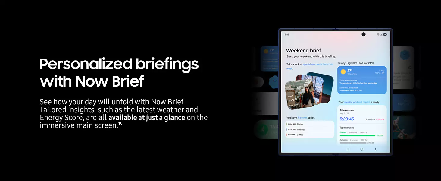 Stay one step ahead with a phone that gives you the info you need before you even know you need it. Now Brief on Galaxy Z Fold7 provides you with personalized insights to help you prepare for your day, including information about your daily appointments, the weather and more.