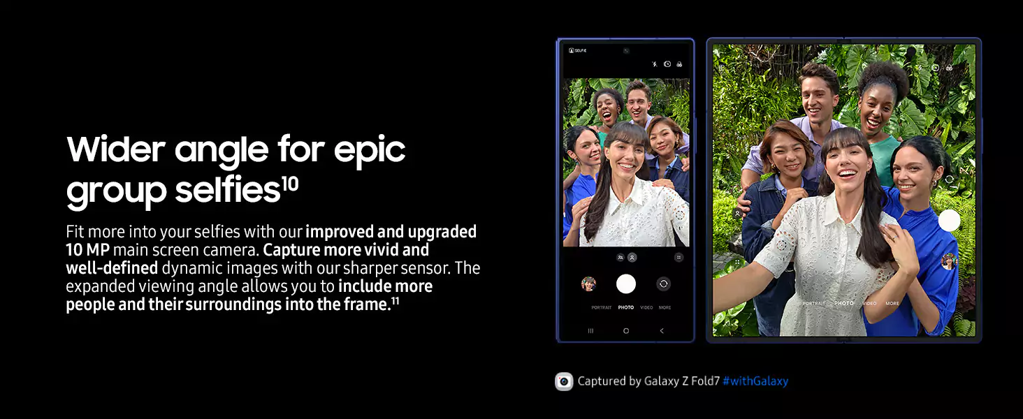 Effortlessly elevate your selfie game on Galaxy Z Fold7. Galaxy AI recognizes your environment’s lighting and captures accurate skin tones and textures so each portrait brings out everyone’s best side —without the extra editing.