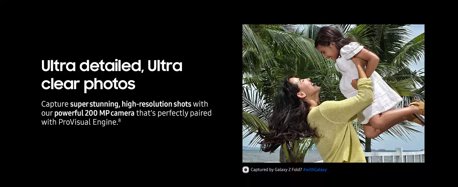 Expand what’s possible with Galaxy Z Fold7, the foldable that’s designed to do so much more than before. The expanded 6.5″ cover display is made to feel like a traditional smartphone, making it more convenient to handle daily tasks from text replies to checking the weather without needing to unfold. For even more possibilities, open up the impressive 8″ screen to create, unwind, multitask and more. For the first time ever for a foldable, Galaxy Z Fold7 boasts a 200MP camera with ProVisual Engine so you can take stunning photos with ease. Perfecting your pics feels just as effortless. Enjoy plenty of room on the expansive inner screen to make tiny adjustments, like zooming in to delete that stranger in the background with Photo Assist or ensuring everyone’s eyes are open in the group selfie with Best Face. Whether you’re at home or on the go, creating on the large screen of Galaxy Z Fold7 is as comfortable as it gets.