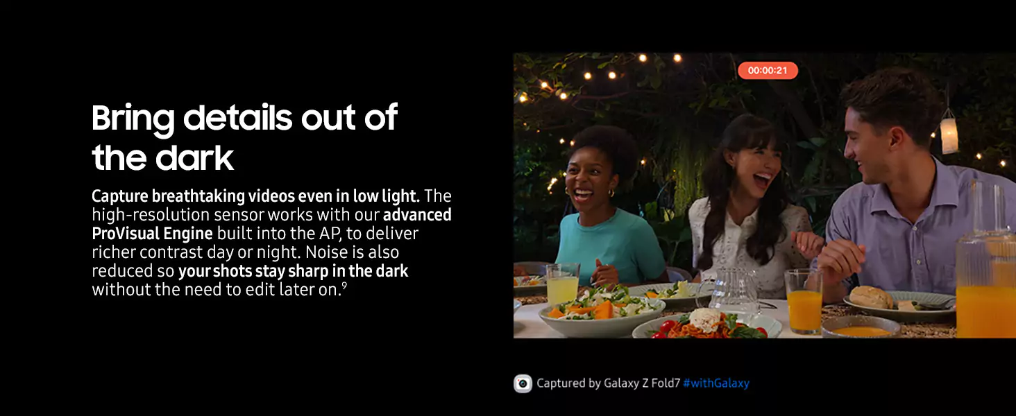 With Galaxy Z Fold7, you can capture wow-worthy videos, even in dark or noisy environments. Use Night Video to capture your evening out with friends in vivid detail. Then minimize unwanted sounds, like the noisy person next to you, so you can relive your favorite moments with fewer distractions.