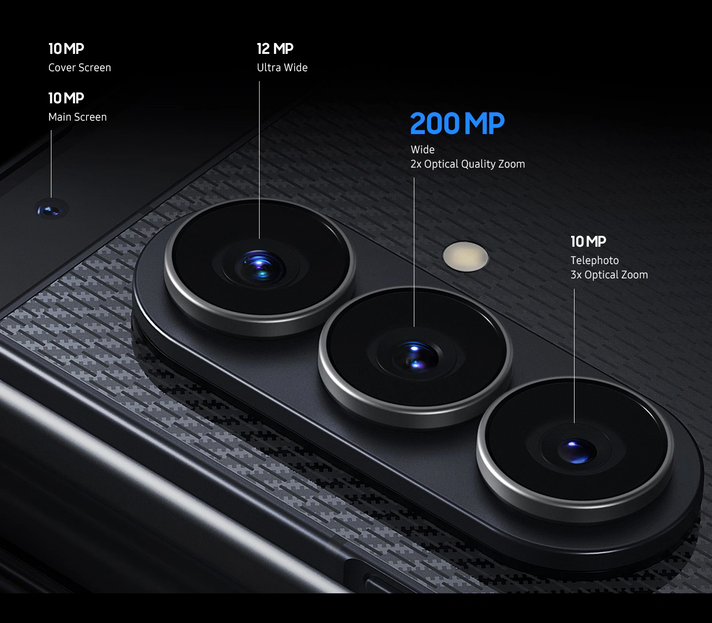 • Versatile Cameras: Equipped with a pro-grade triple rear camera setup: a 200MP main sensor with OIS, a 12MP ultra-wide lens, and a 10MP telephoto lens with 3x optical zoom and OIS. Dual 10MP selfie cameras are present on both the cover and inner displays.