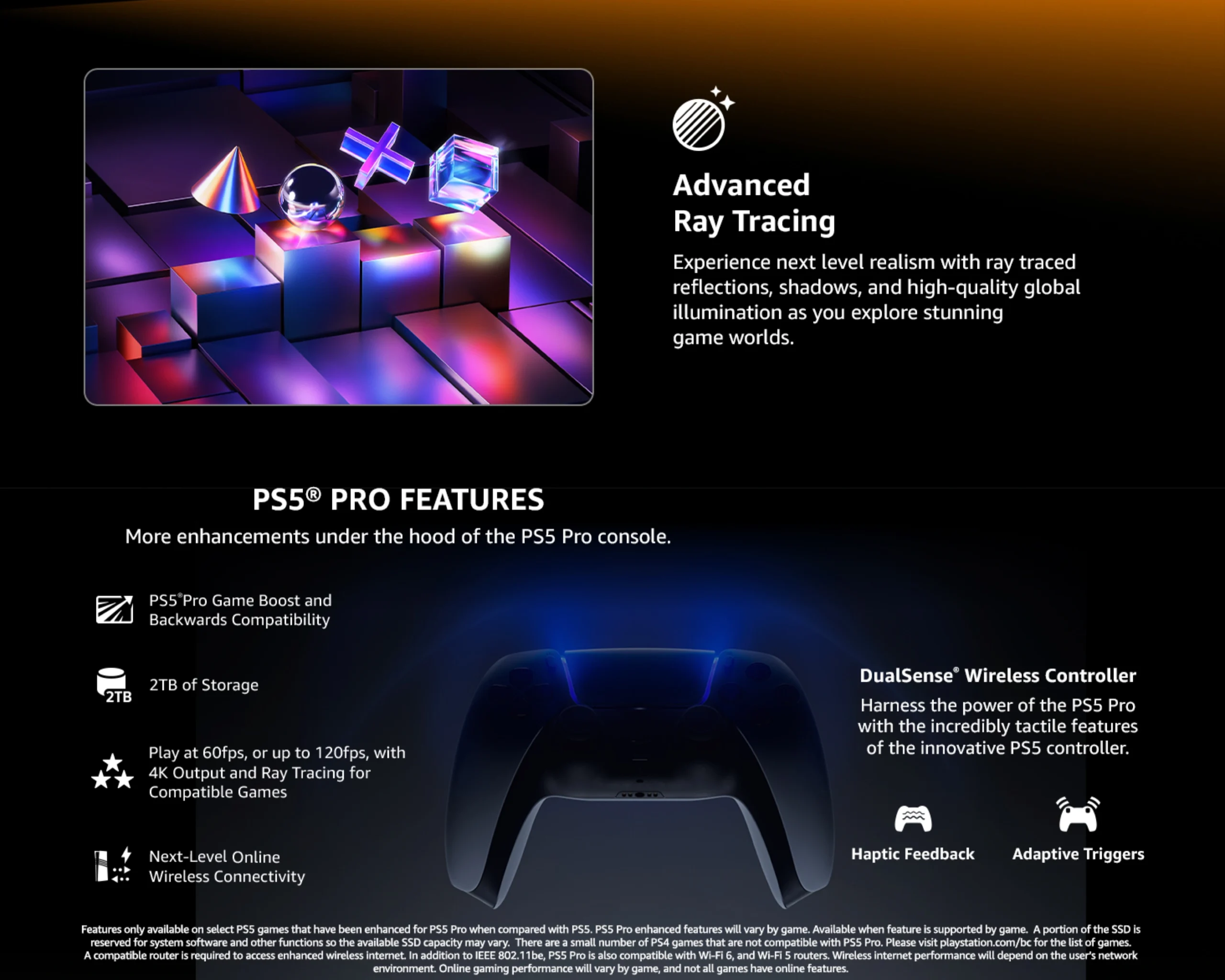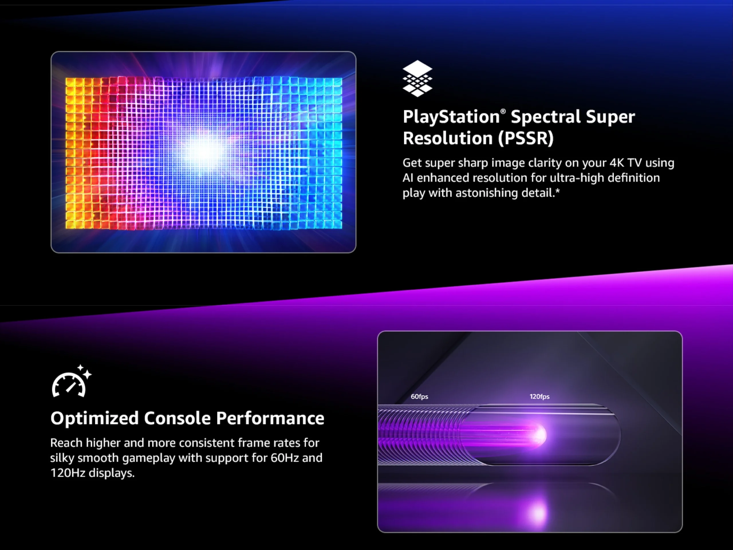 With the power of the PS5 Pro, compatible games can be played at 60fps, or up to 120fps, with Ray Tracing and AI enhanced 4K resolution using PSSR— all at the same time—on your 4K TV. - PS5 Pro Game Boost and Backwards Compatibility