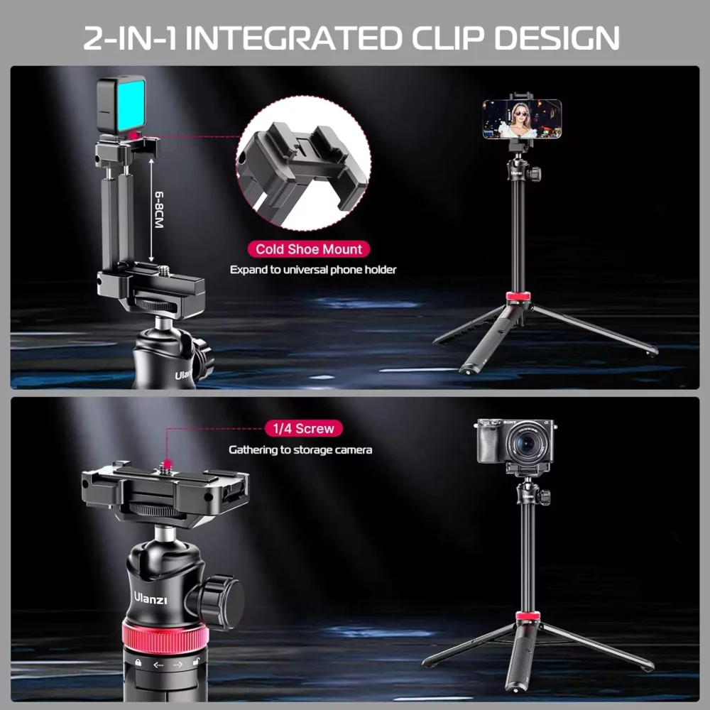 The MT-44 Extendable Vlog Tripod from Ulanzi can be used as a mini tripod or a selfie stick for compact cameras and smartphones. It adjusts from a collapsed 12.7″ to 43″ in four sections. The bottom handle opens up to function as a tripod base.