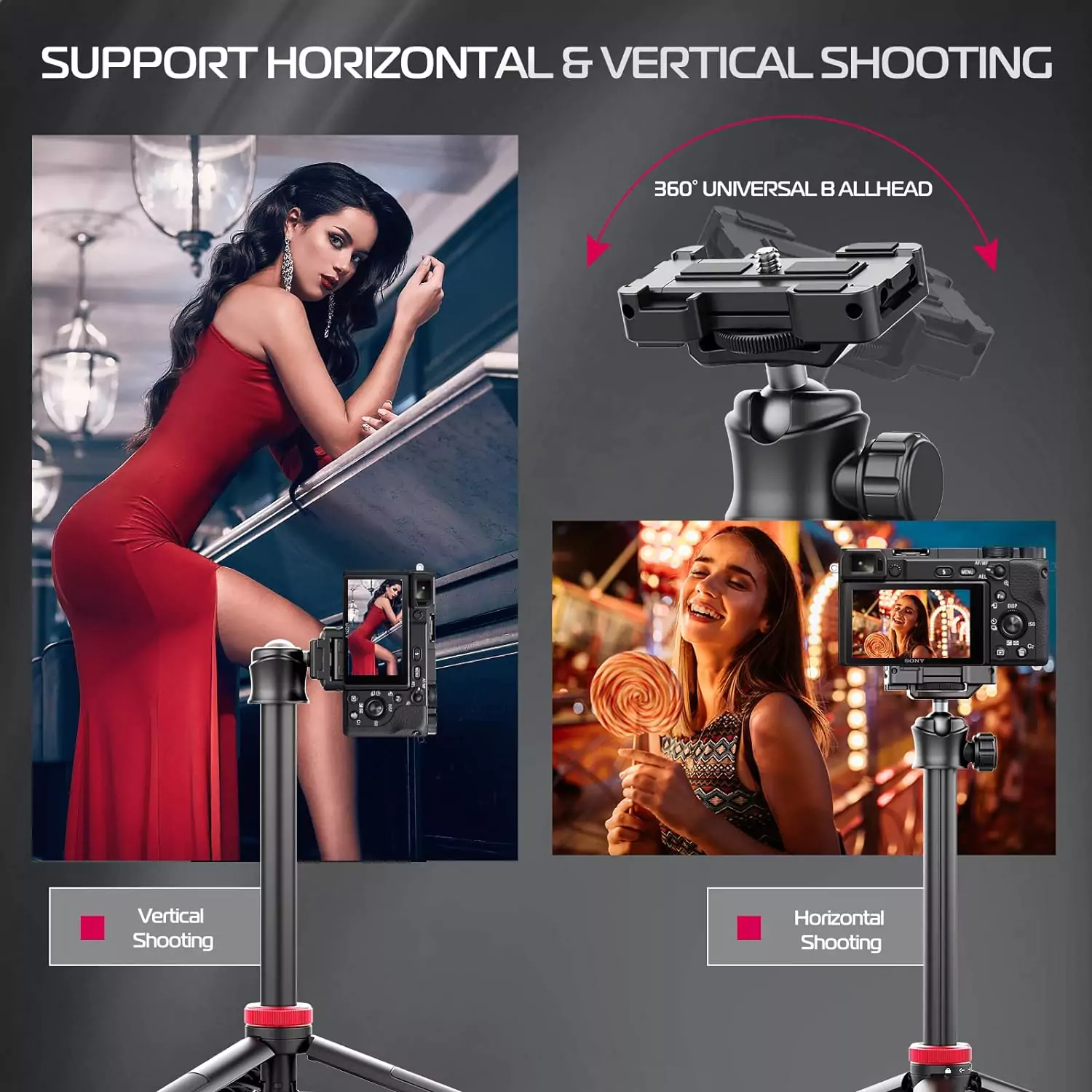 The camera mount on top transforms between a camera platform with a standard 1/4″-20 mounting screw to an adjustable smartphone holder. The camera mount sits on a ball head, which offers 360° rotation as well as 90° tilt adjustment, which would allow you to set up your camera or phone in landscape or portrait modes.