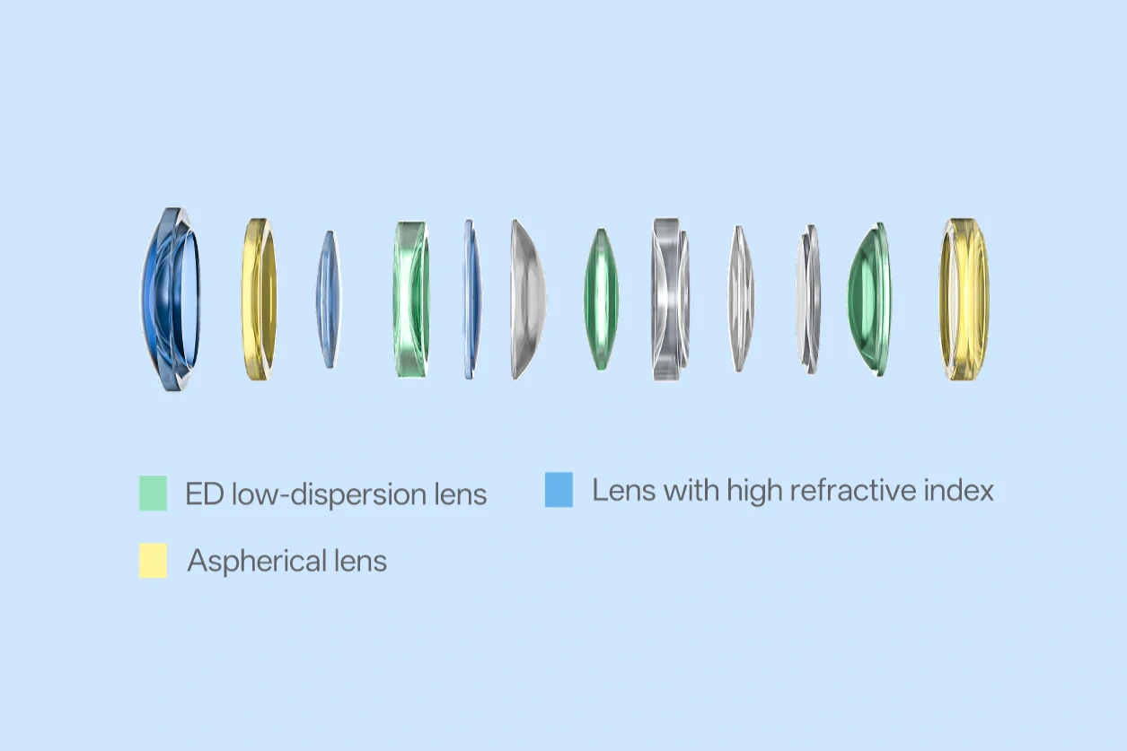 - Twelve elements in ten groups, including three ED lenses, three HR lenses, and two aspherical lenses, to reduce flare and ghosting for improved contrast
