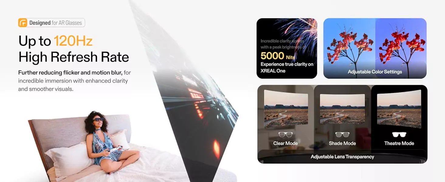 XREAL One features a 0.68” Sony Micro-OLED display and a proprietary optics engine. Massive virtual screen size of up to 147″ (equivalent to a projection from a 4-meter distance), with a 50° FOV, peak brightness 5000 nits, perceived brightness 600 nits, enjoy industry-leading visuals.