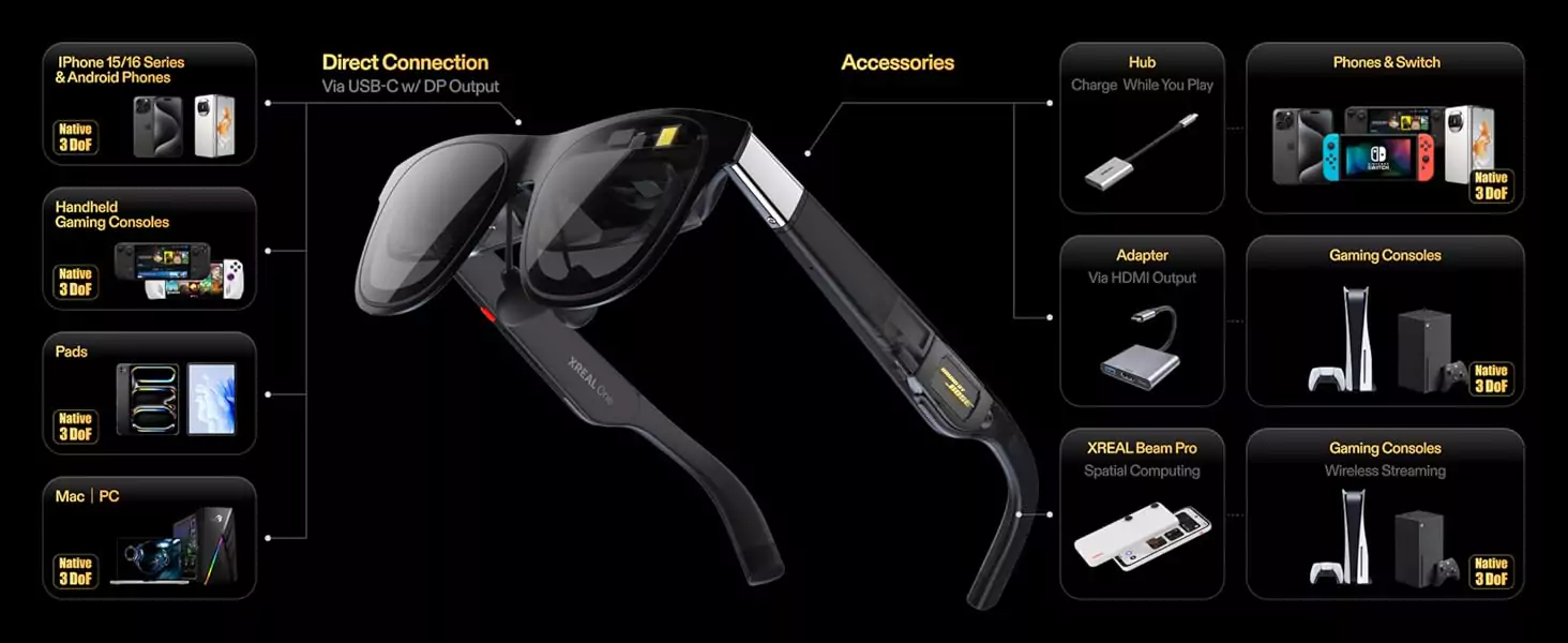 Effortlessly connect to any device with USB-C video output, including Phone 16/15, Pad, select Android phones (supports DP output), Steam Deck, ROG Ally, MacBook, Windows PCs, and more. Nintendo Switch requires an additional purchase of XREAL Hub to connect to the glasses. An additional adapter may be required for the Phone 14 and earlier.